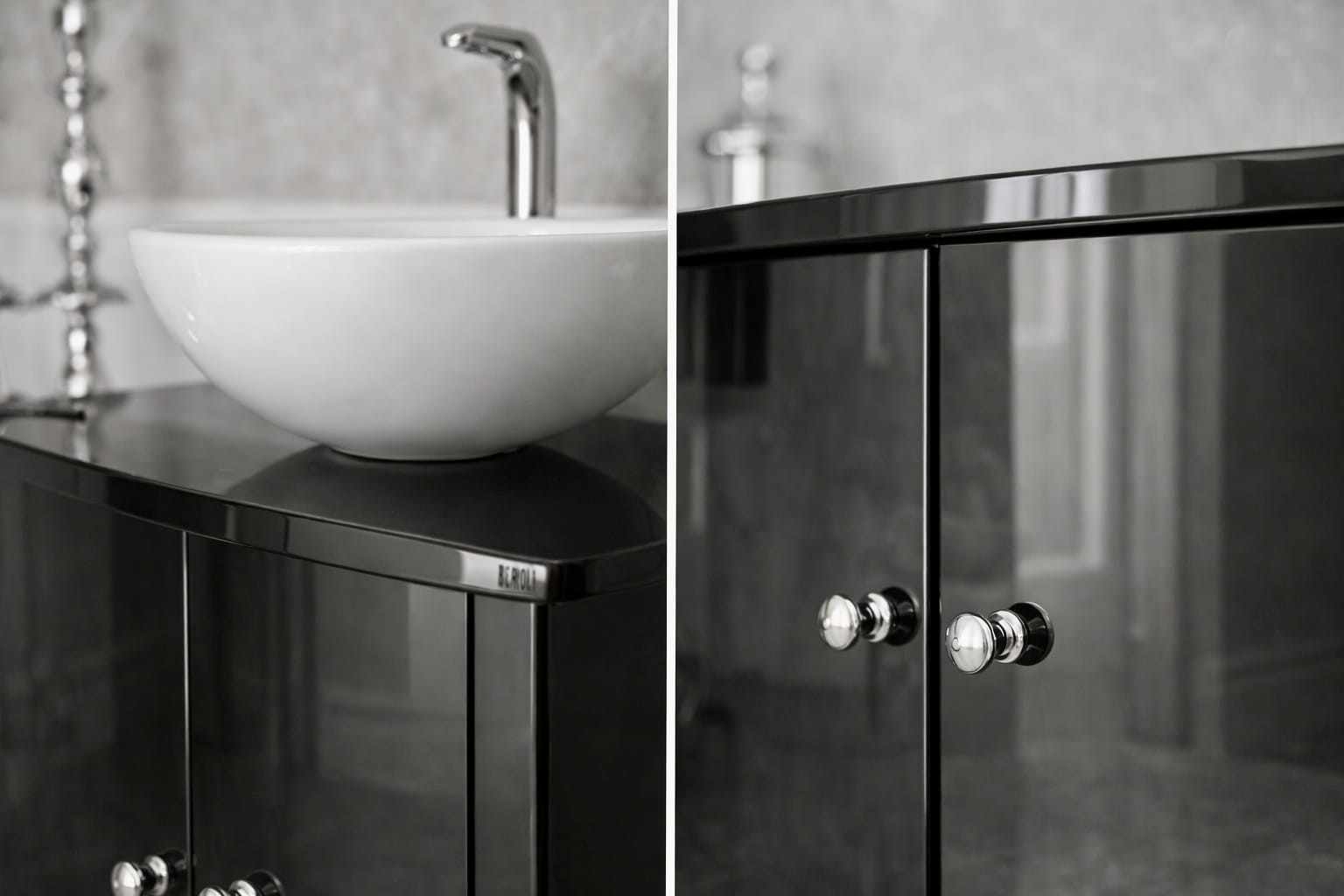 Komoda ADEJA to stylowy mebel w eleganckiej stylistyce glamour, który łączy ponadczasowy design z wysoką trwałością i funkcjonalnością. Dzięki starannemu wykonaniu, szlachetnym materiałom oraz dopracowanym detalom doskonale sprawdzi się jako luksusowa komoda łazienkowa lub element wyposażenia eleganckiego wnętrza.