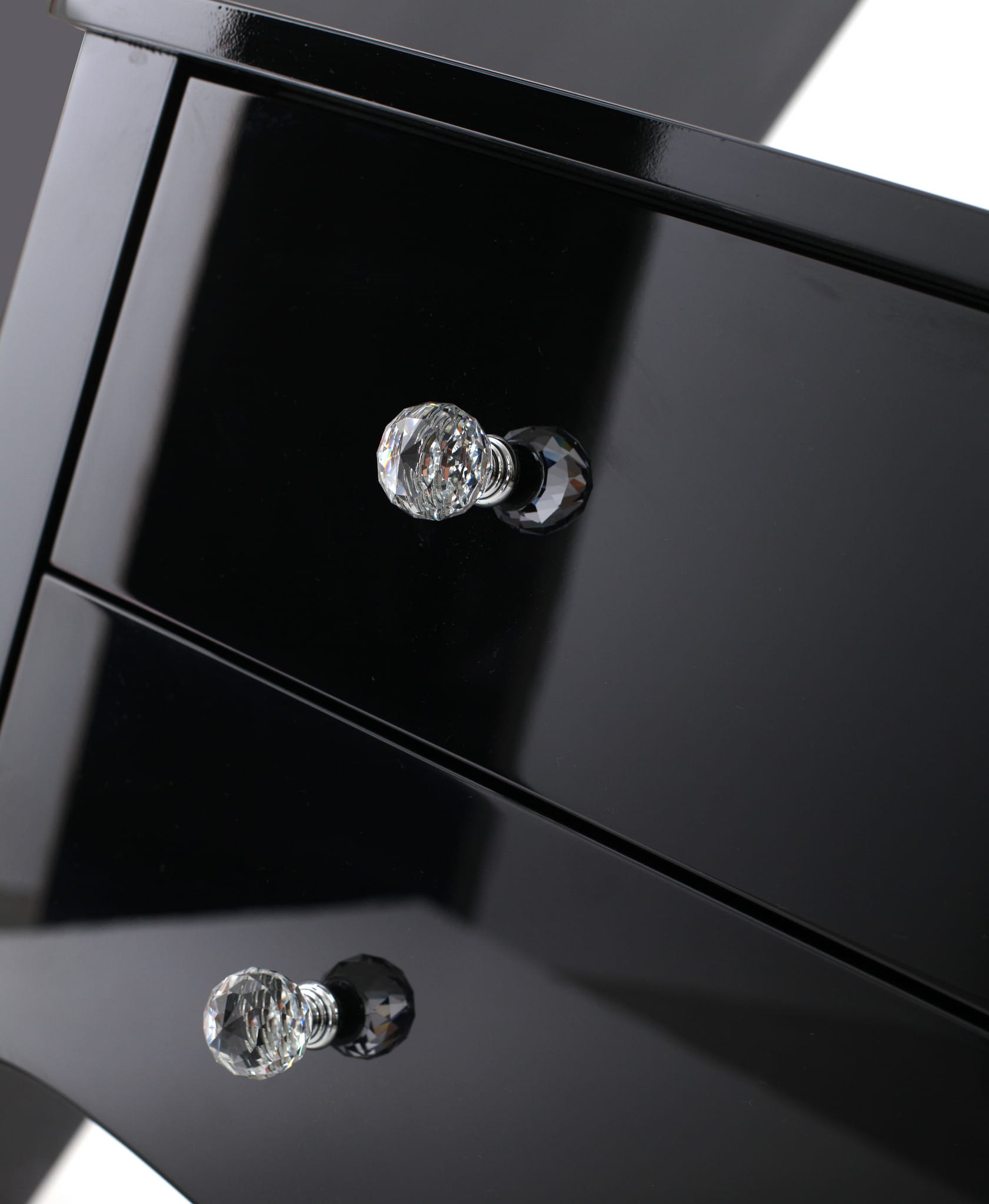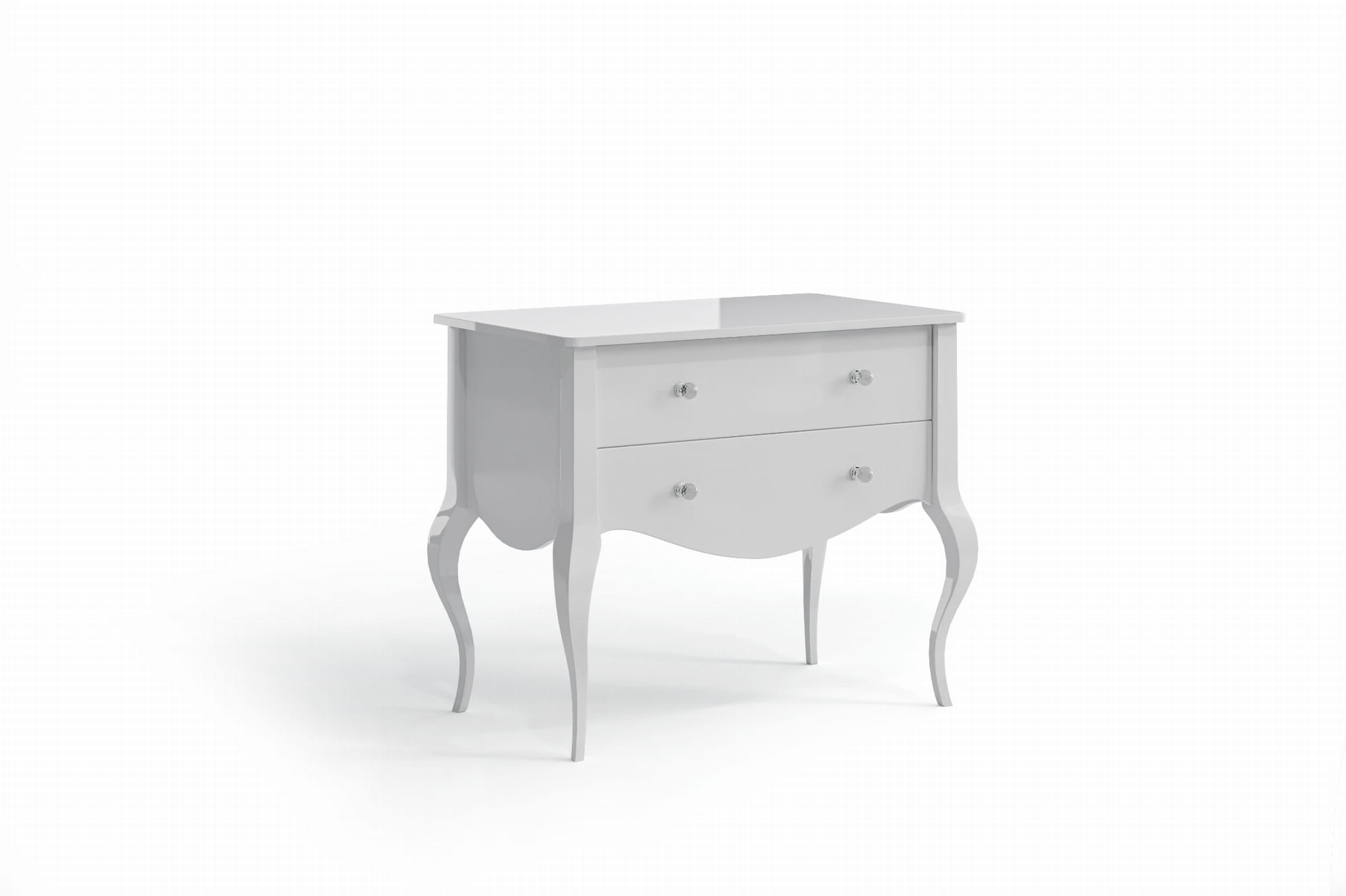Kryształowe uchwyty nadają meblowi ekskluzywny wygląd. Komoda na giętych nogach. Użyty materiał to lite drewno, mdf.