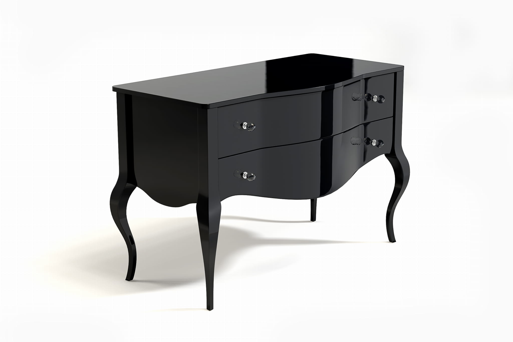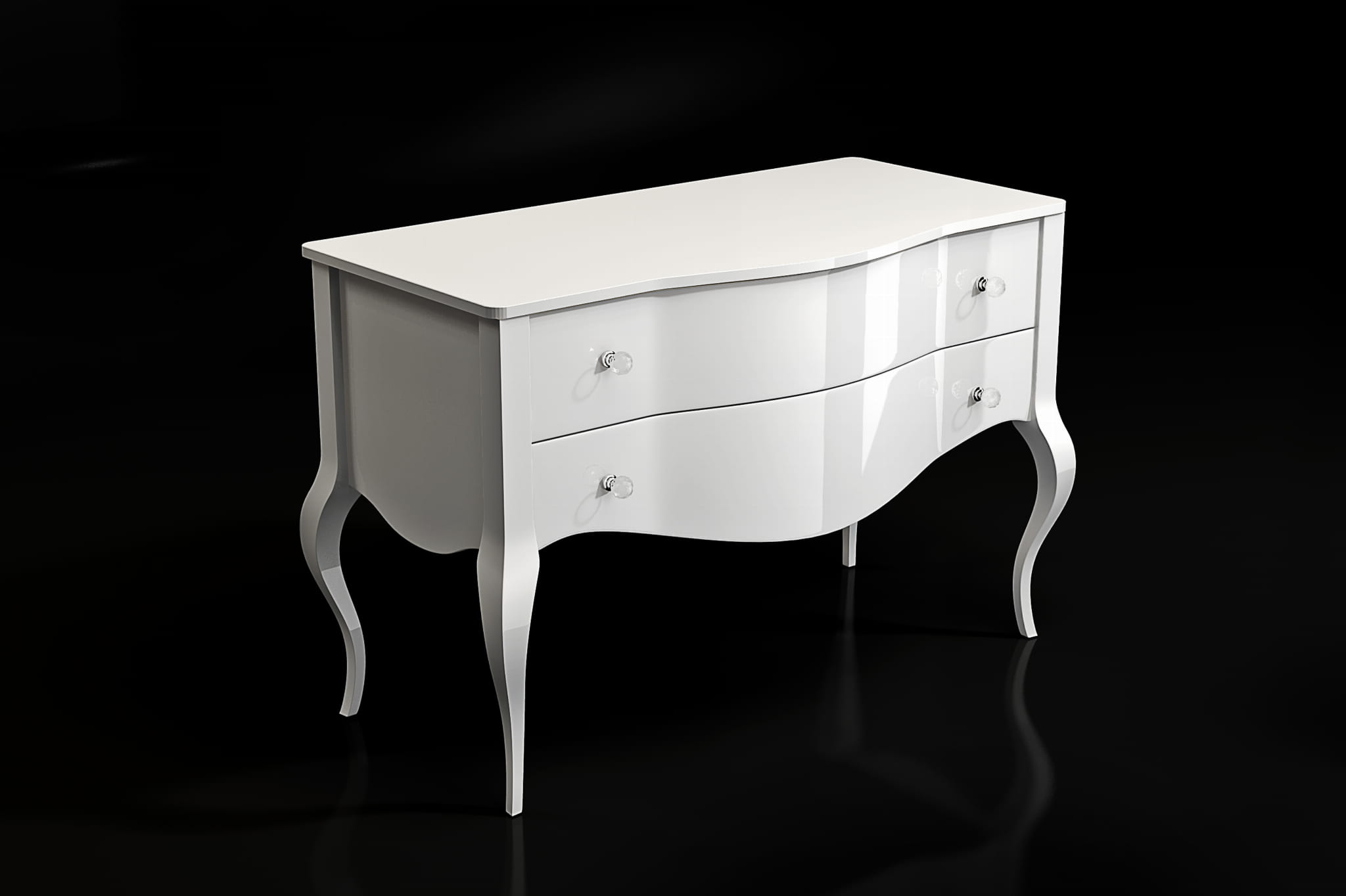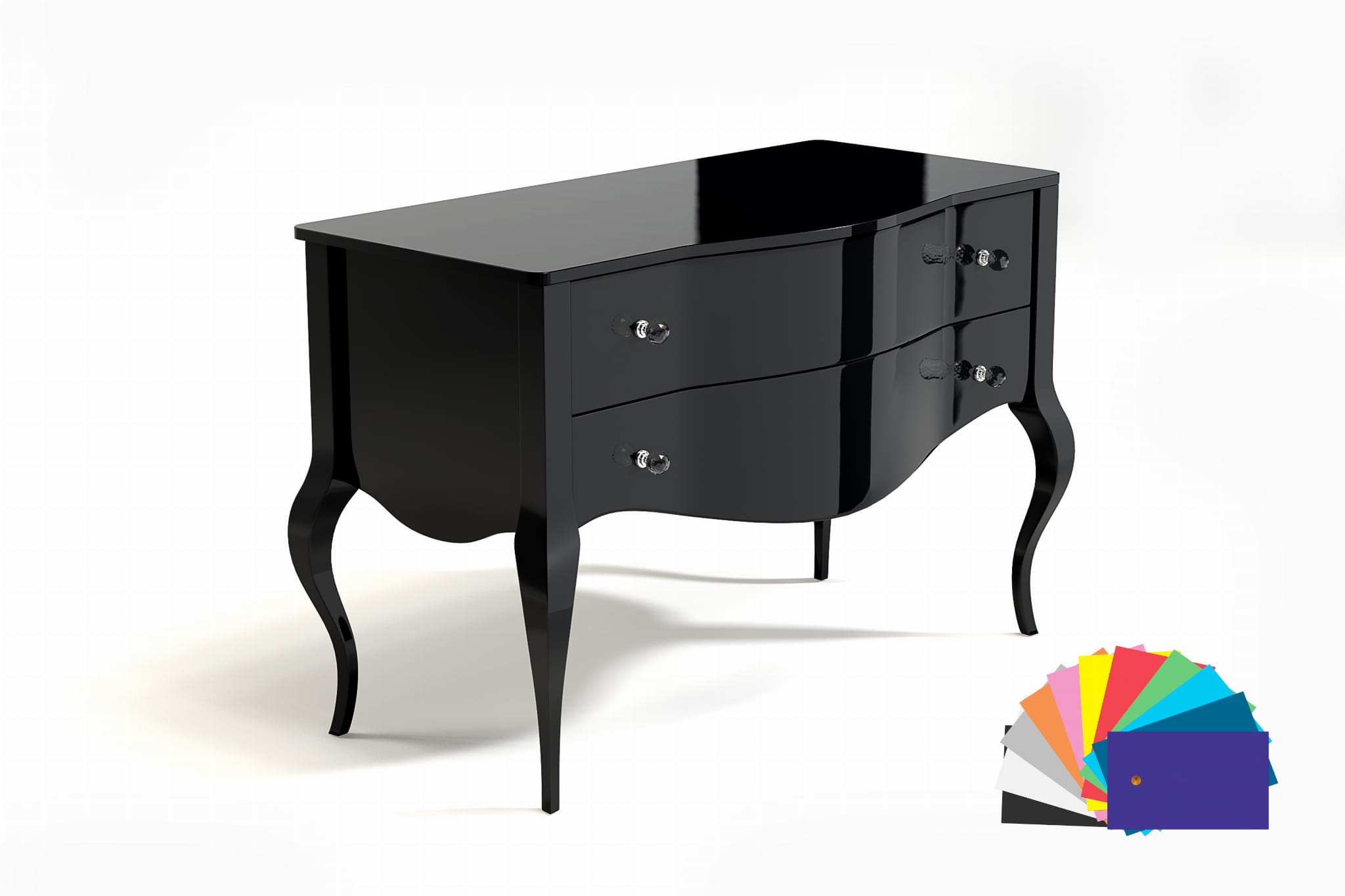 Powierzchnia komody wykańczana jest przy użyciu 7 warstw wysokiej jakości włoskich lakierów, które następnie są ręcznie szlifowane i polerowane. Dzięki temu mebel uzyskuje idealną głębię połysku lub subtelny satynowy efekt.