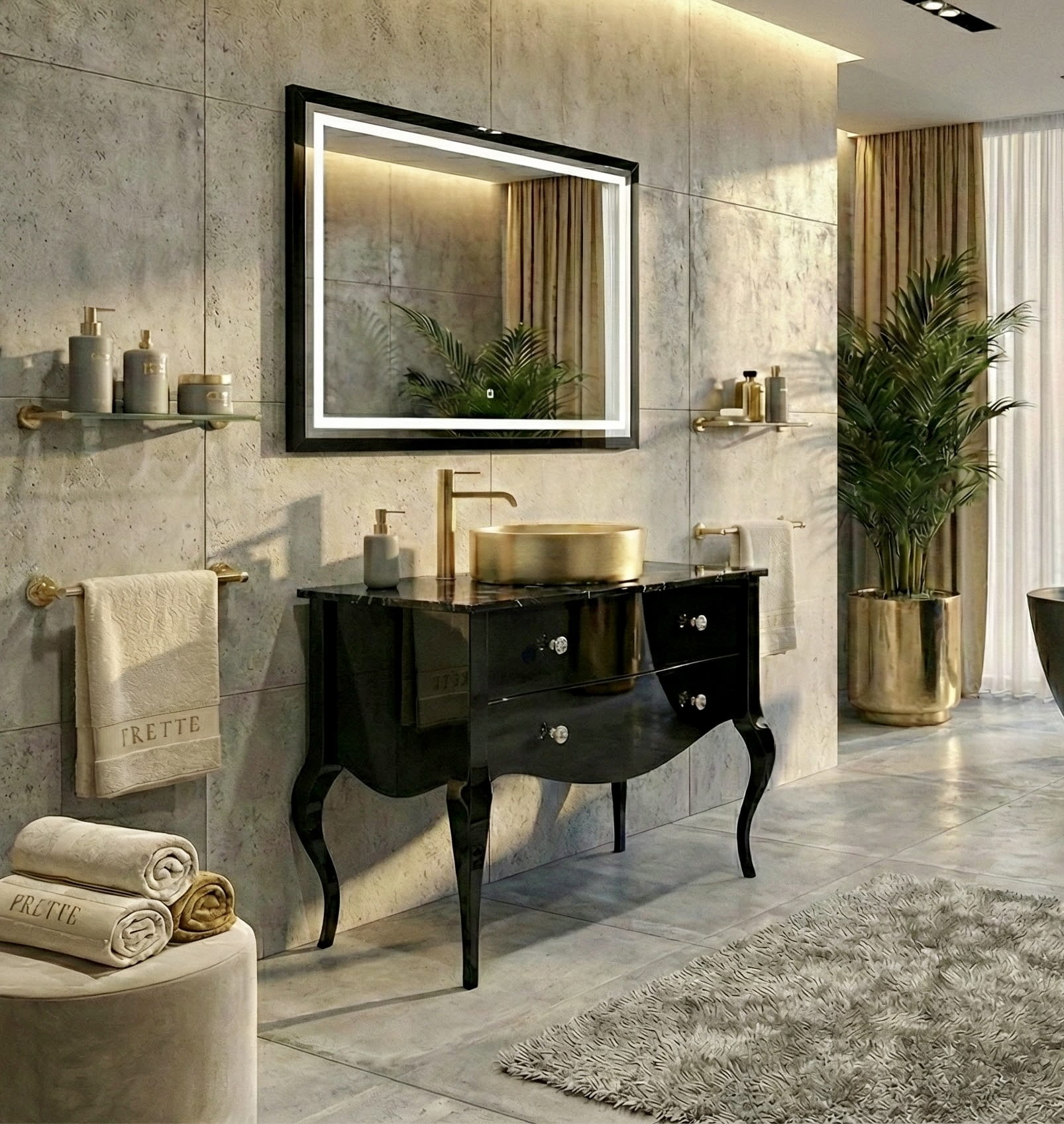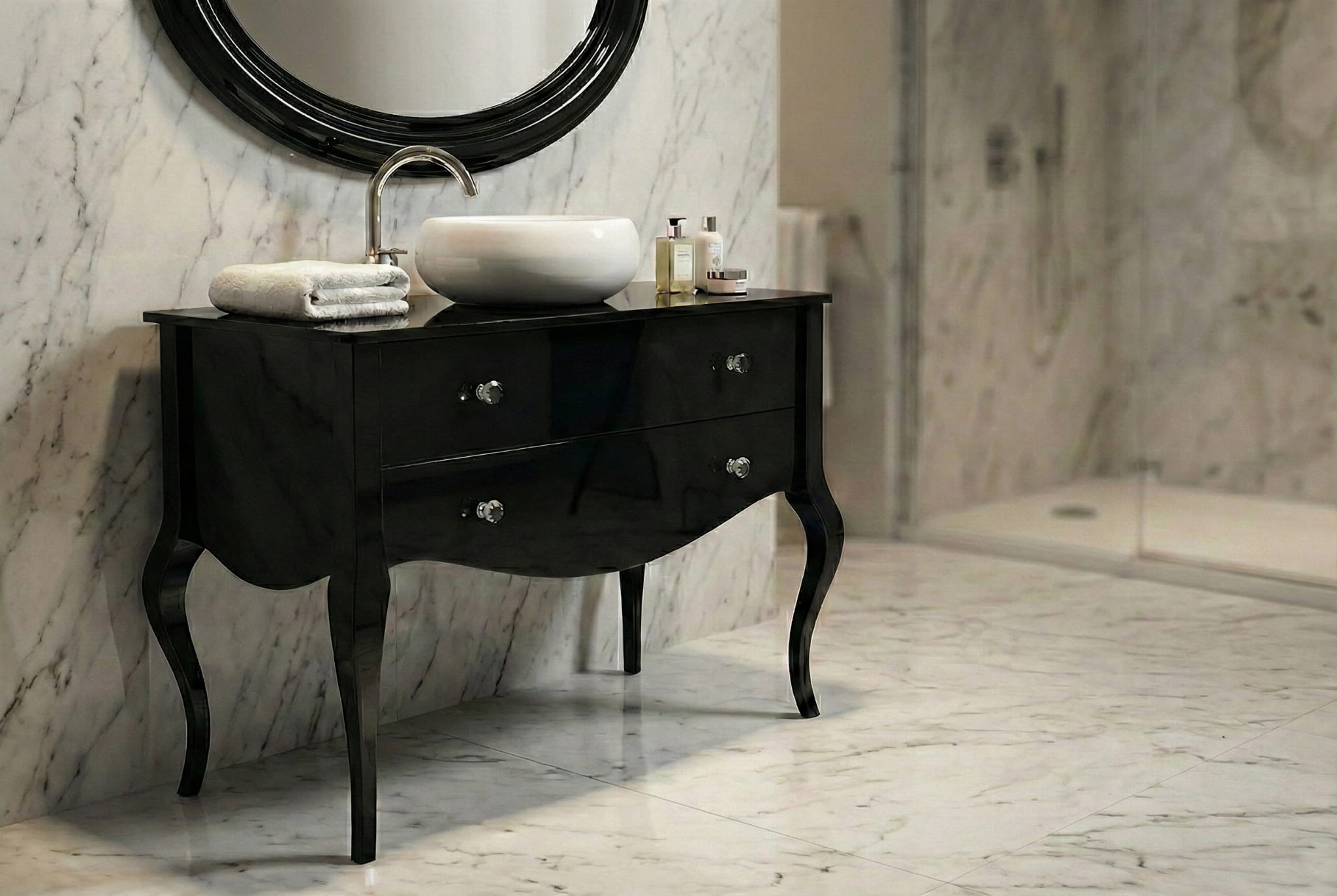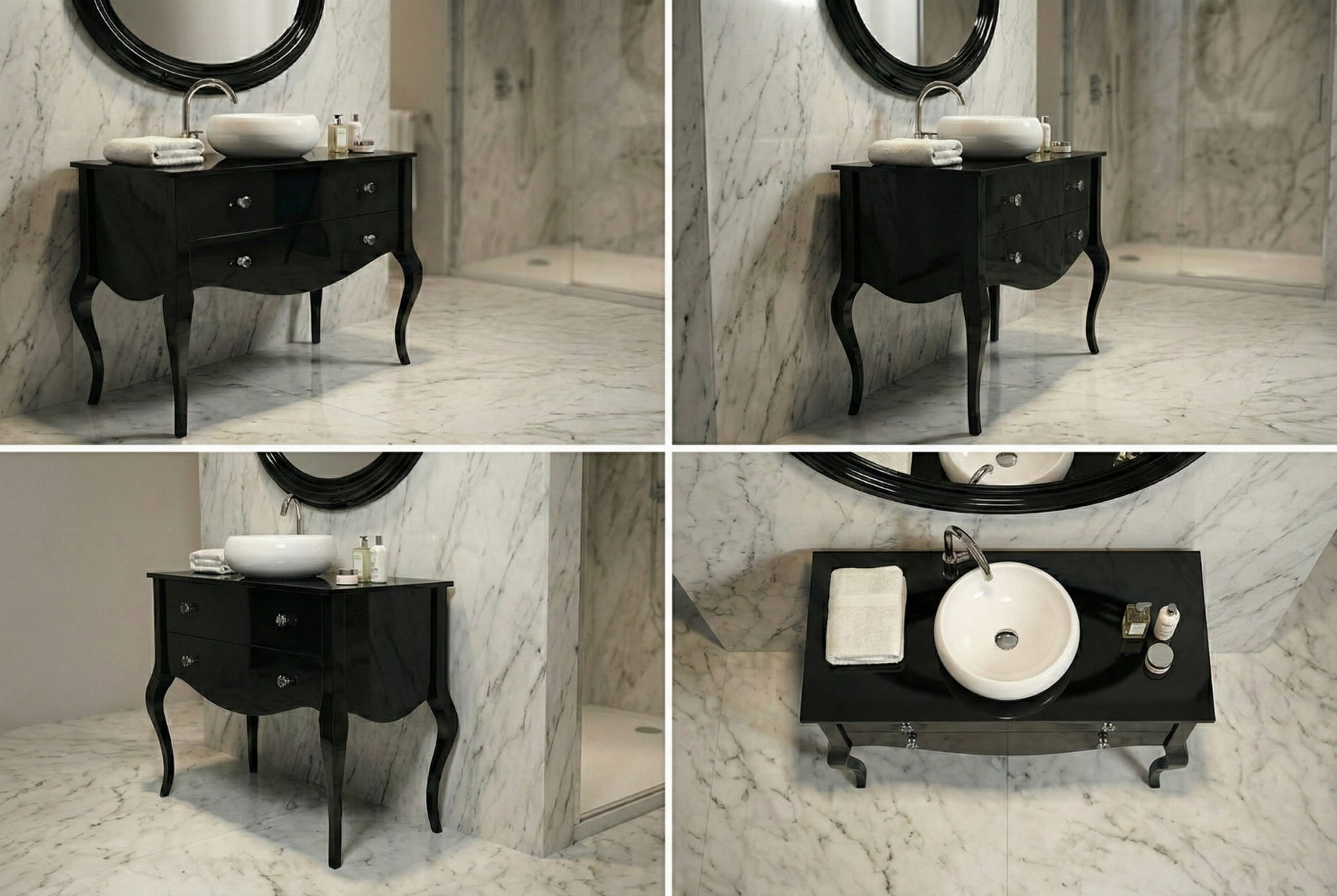 Komoda SARAGOSSA to stylowy mebel w eleganckiej stylistyce glamour, który łączy ponadczasowy design z wysoką trwałością i komfortem użytkowania. Dzięki starannie dobranym materiałom oraz dopracowanym detalom doskonale sprawdzi się zarówno jako luksusowa komoda łazienkowa, jak i element wyposażenia eleganckiego wnętrza.