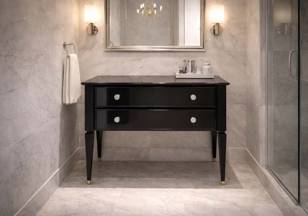 Forma mebla doskonale wpisuje się w aranżacje w stylu art déco, glamour oraz nowoczesnych łazienek premium.