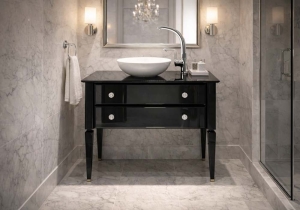 Forma mebla doskonale wpisuje się w aranżacje w stylu art déco, glamour oraz nowoczesnych łazienek premium.