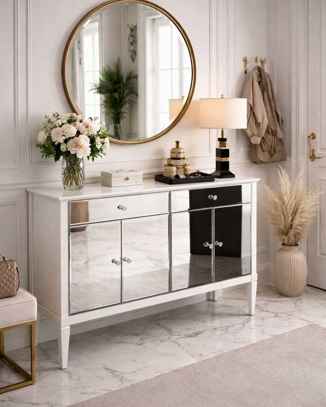 Wykończenie w białym wysokim połysku podkreśla luksusowy charakter komody i doskonale wpisuje się w aranżacje glamour, modern classic oraz styl nowojorski.