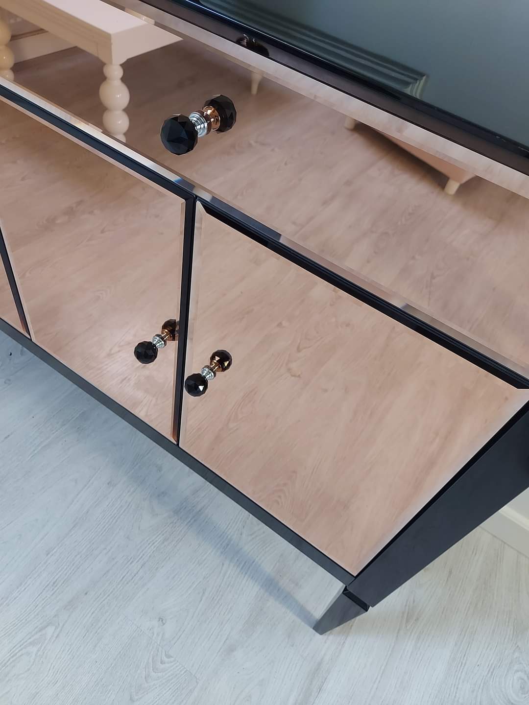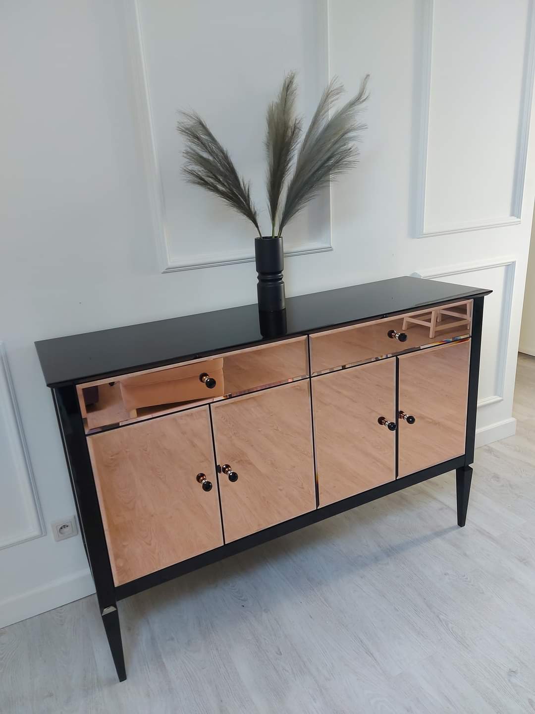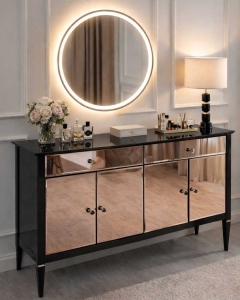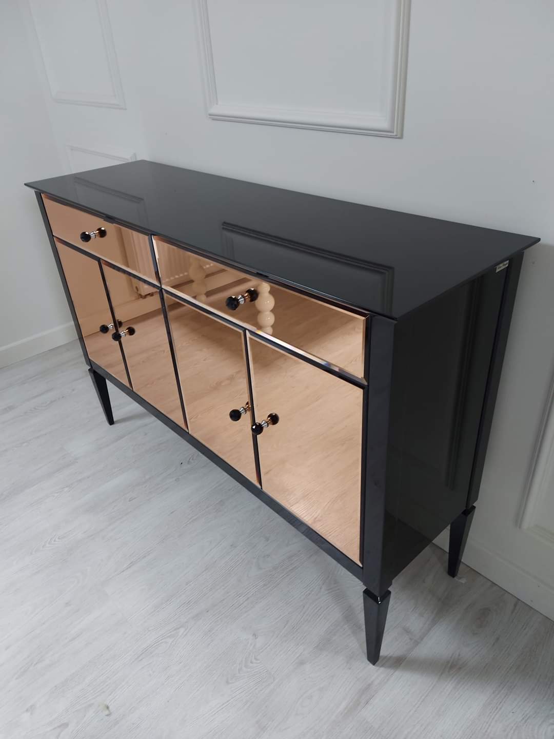 Fronty komody pokryte fazowanym lustrem nadają meblowi blasku oraz wyjątkowej głębi, tworząc spektakularny efekt wizualny. Wykończenie w czarnym wysokim połysku dodatkowo podkreśla elegancję bryły i nadaje wnętrzu charakter luksusowego apartamentu w stylu nowojorskim.