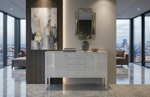 Stylizowana komoda glamour KASTYLIA w białym wysokim połysku to wyjątkowe połączenie elegancji, ponadczasowego designu i najwyższej jakości wykonania. Mebel powstał z myślą o klientach, którzy poszukują luksusowych i niepowtarzalnych elementów wyposażenia wnętrz.