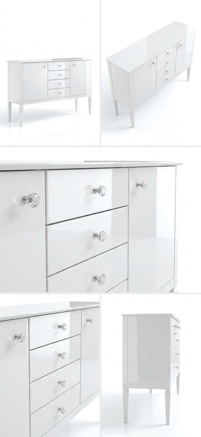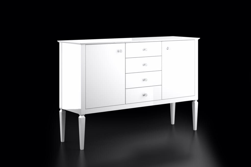 Subtelne kryształowe uchwyty nadają meblowi ekskluzywnego charakteru, a nogi komody inspirowane szlifem diamentu podkreślają jej wyjątkowy styl i lekkość bryły. Wykończenie w białym wysokim połysku pięknie odbija światło, nadając wnętrzu luksusowego charakteru.