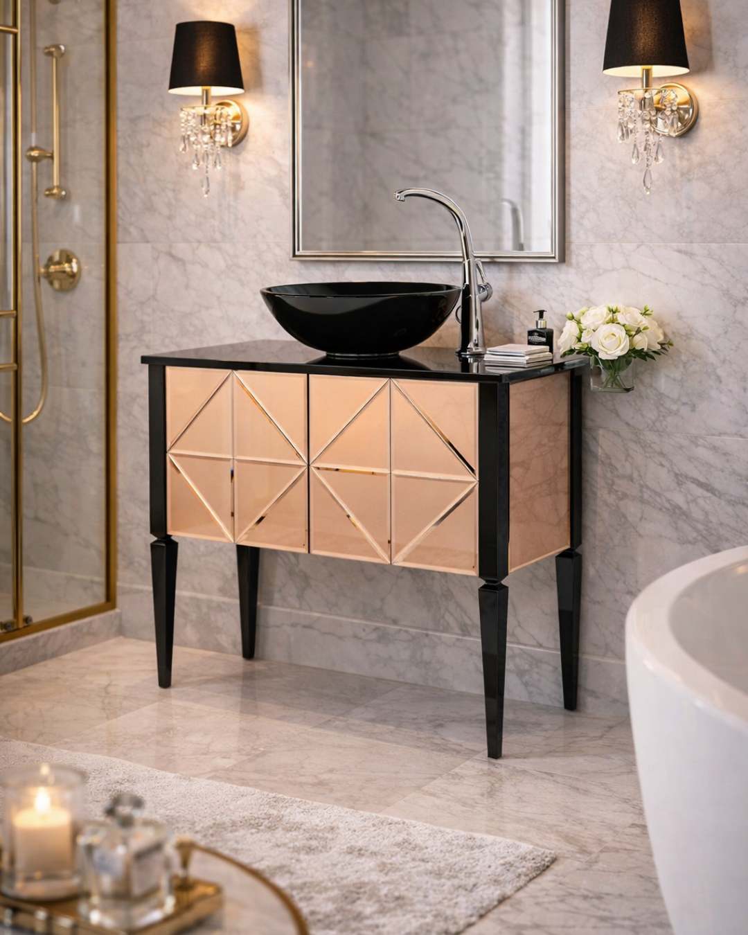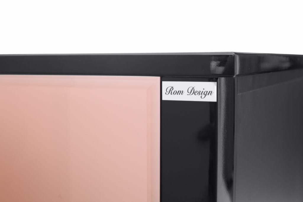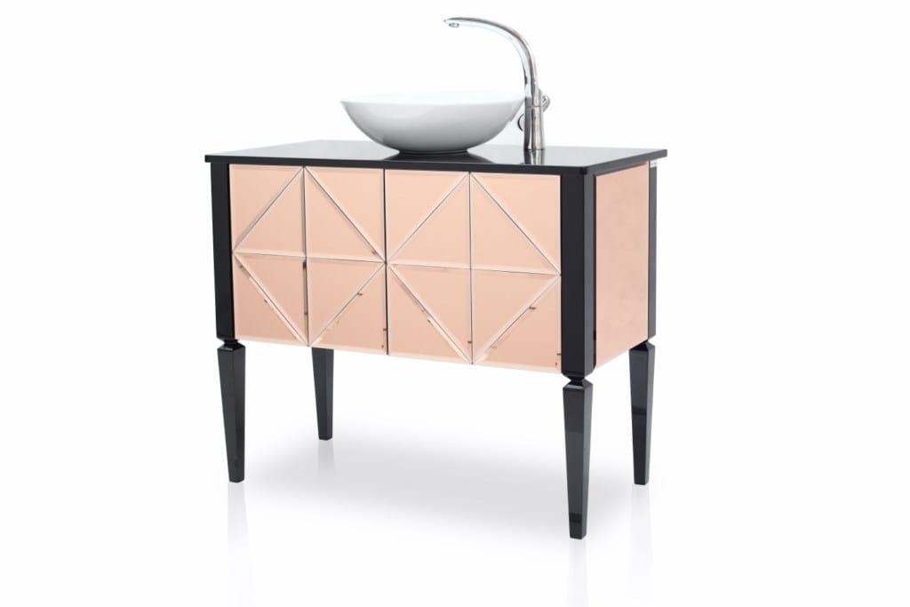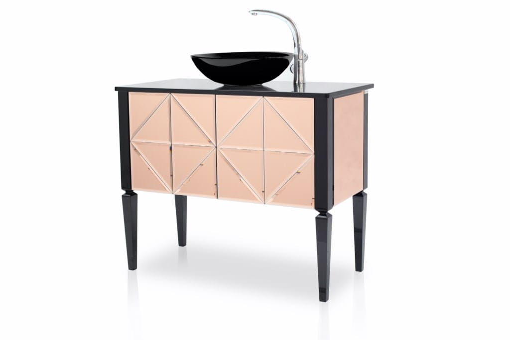 Komoda glamour lustrzana, luksusowa CATALUNA 92 cm, miedziana pod umywalkę, styl nowojorski, czarny wysoki połysk