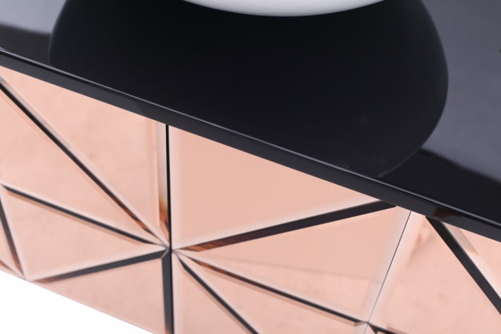 Niepowtarzalny wzór komody glamour CATALUNA sprawia, że staje się ona niezwykle efektownym elementem dekoracyjnym nawet najbardziej wymagających wnętrz. Fronty oraz boki komody pokryte są elegancką mozaiką z fazowanego lustra w kolorze miedzi, która nadaje meblowi wyjątkowego blasku i subtelnej, luksusowej elegancji.