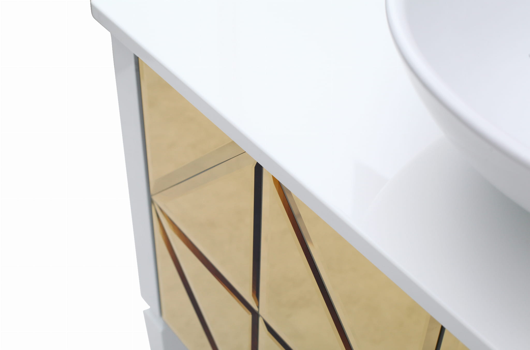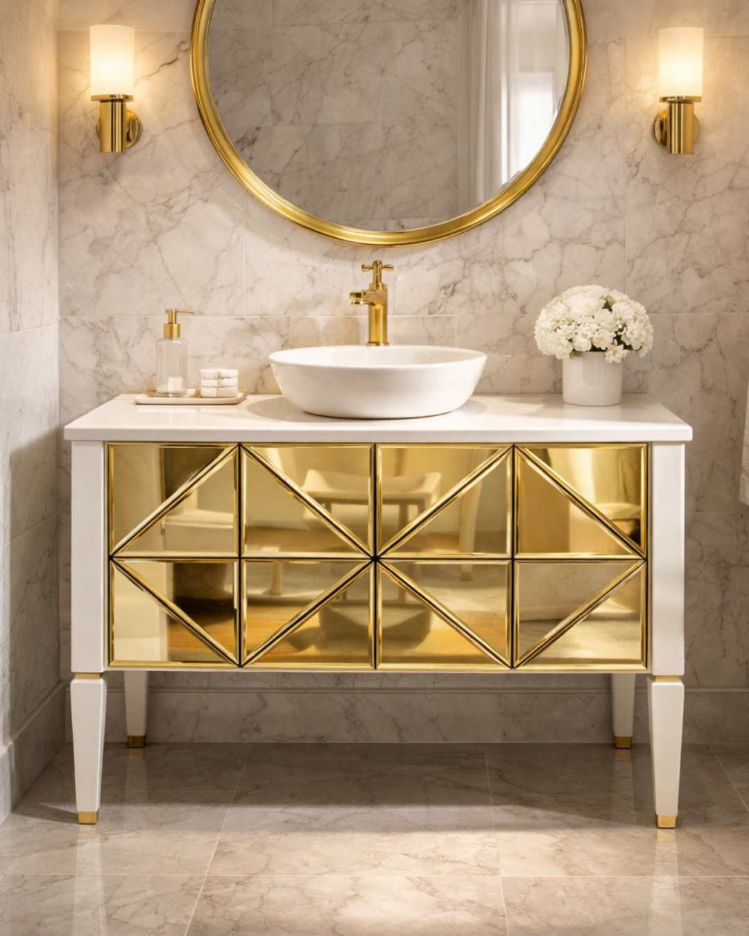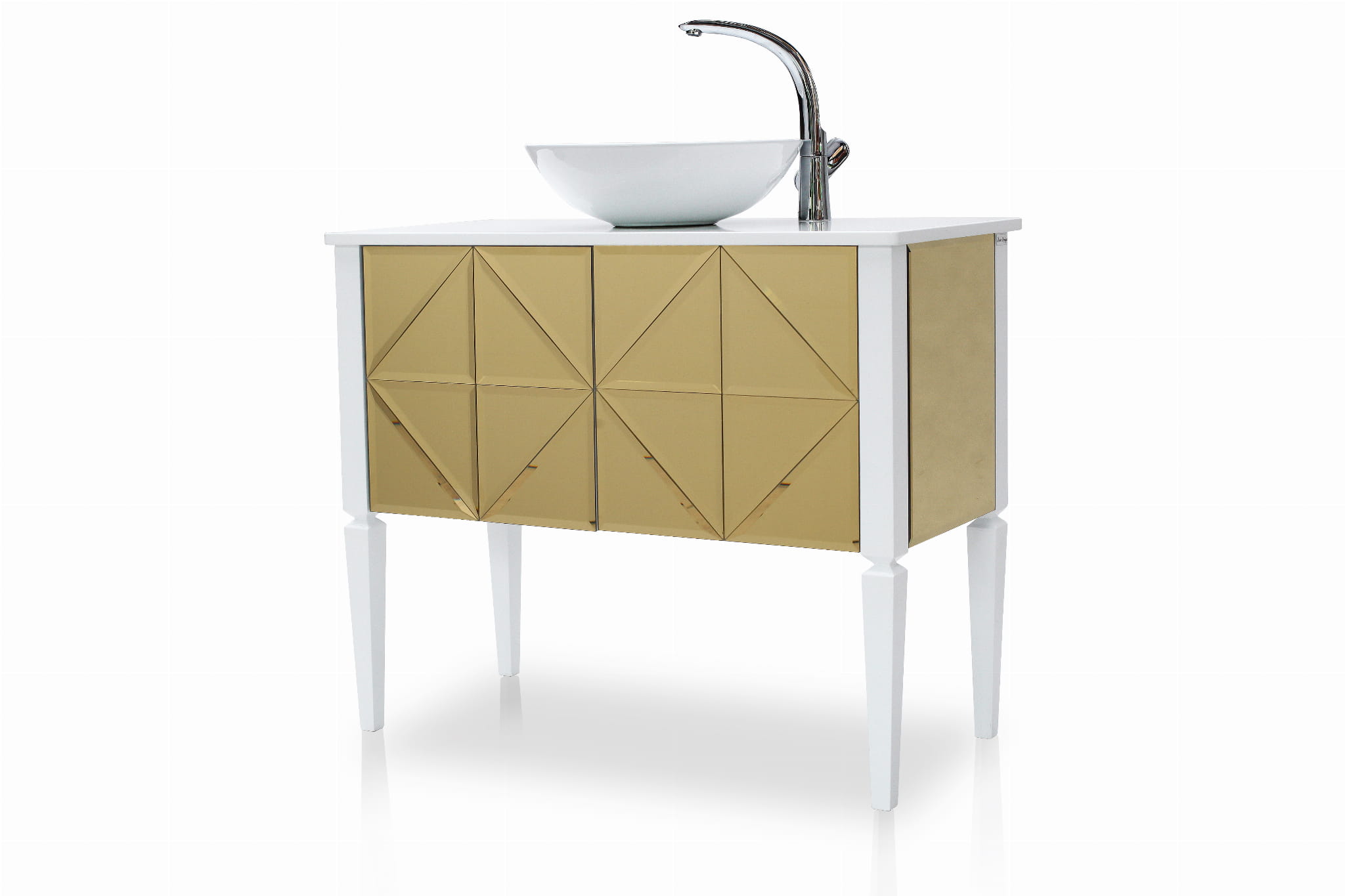 Komoda glamour lustrzana, luksusowa CATALUNA 92 cm, złota w zestawie z umywalką i baterią, styl nowojorski, biały wysoki połysk