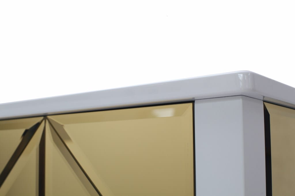 Najbardziej charakterystycznym elementem komody są fronty i boki pokryte lustrzaną mozaiką z fazowanego lustra w kolorze złota. Dekoracyjna powierzchnia pięknie odbija światło, nadając meblowi wyjątkowej głębi oraz eleganckiego, luksusowego charakteru.
