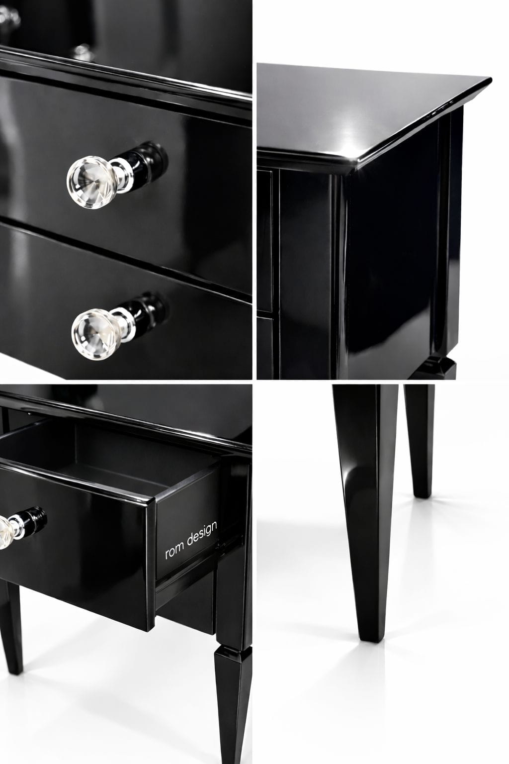 Stolik nocny DIAMOND to esencja kolekcji Diamond w bardziej kompaktowej odsłonie. Szlachetna czerń, wysoki połysk oraz smukła forma tworzą spójną, elegancką kompozycję, która wprowadza do wnętrza harmonię, lekkość i wyrafinowany charakter.