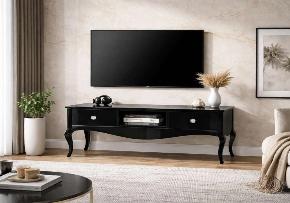 Stolik RTV glamour MERANO 200 cm, nowoczesny, luksusowy, gięte nogi, czarny wysoki połysk