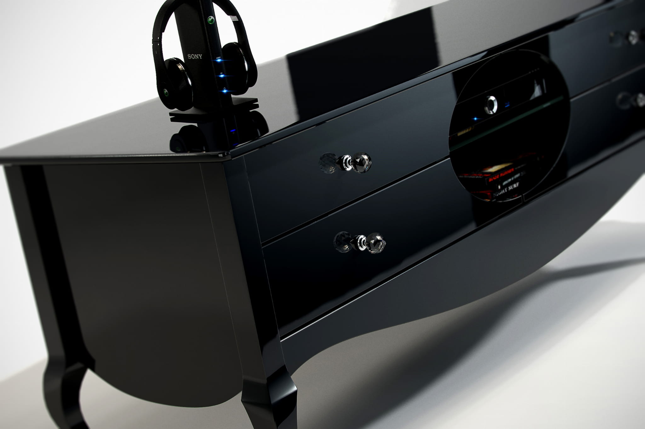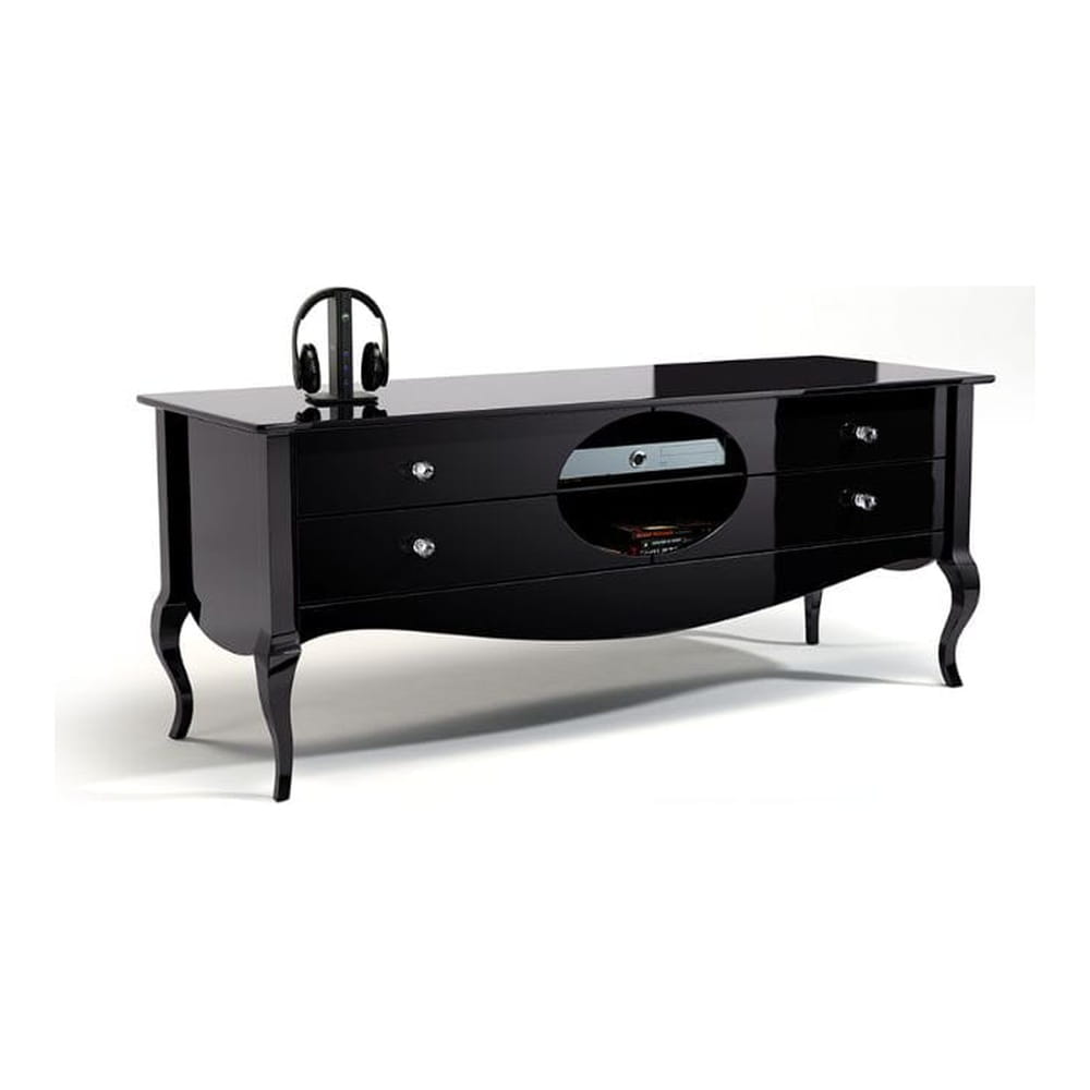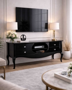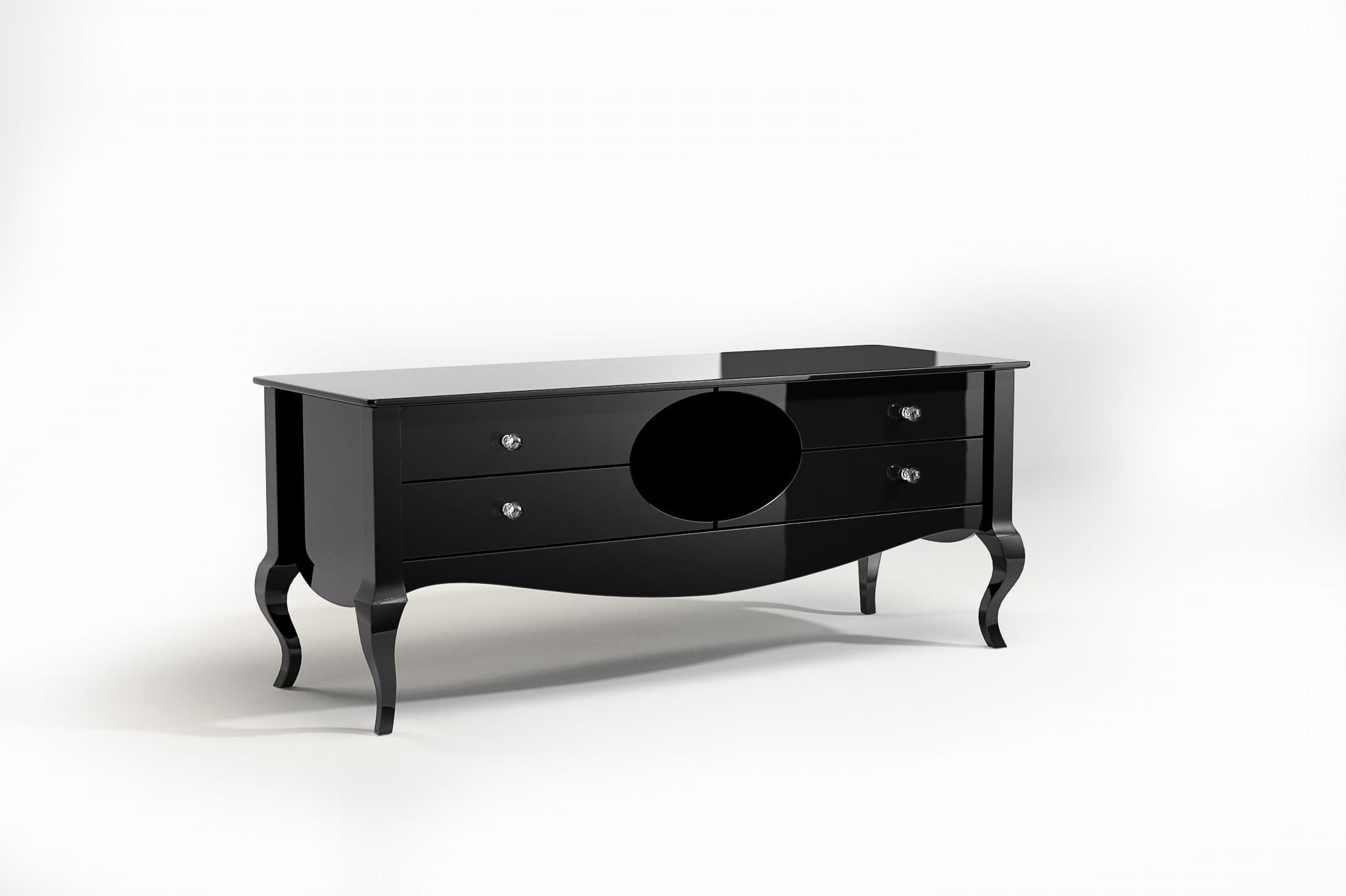 Charakterystyczne gięte nogi w stylu Ludwik XVI nadają meblowi ponadczasowej klasy, a czarny wysoki połysk wprowadza głębię i nowoczesny akcent. Kryształowe uchwyty lub system otwierania na dotyk dopełniają całość, podkreślając ekskluzywny charakter projektu.