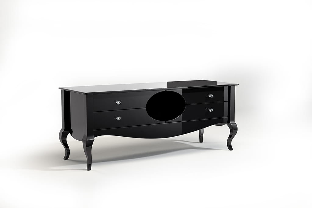Stolik RTV glamour MERSALA to wyjątkowy mebel powstały na podstawie autorskiego, zastrzeżonego projektu. Każdy egzemplarz wykonywany jest ręcznie z najwyższą starannością, co stanowi odpowiedź na potrzeby klientów poszukujących oryginalnych, luksusowych i ponadczasowych mebli do eleganckich wnętrz.