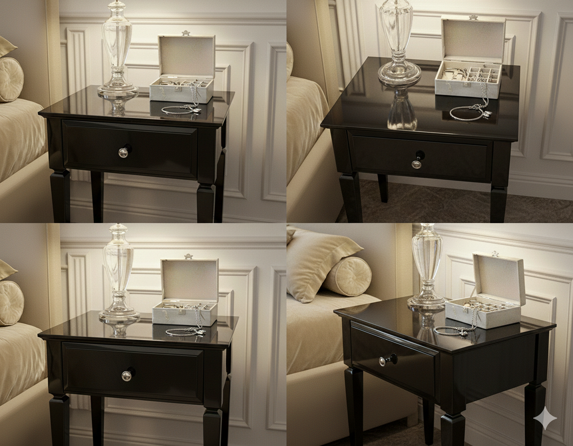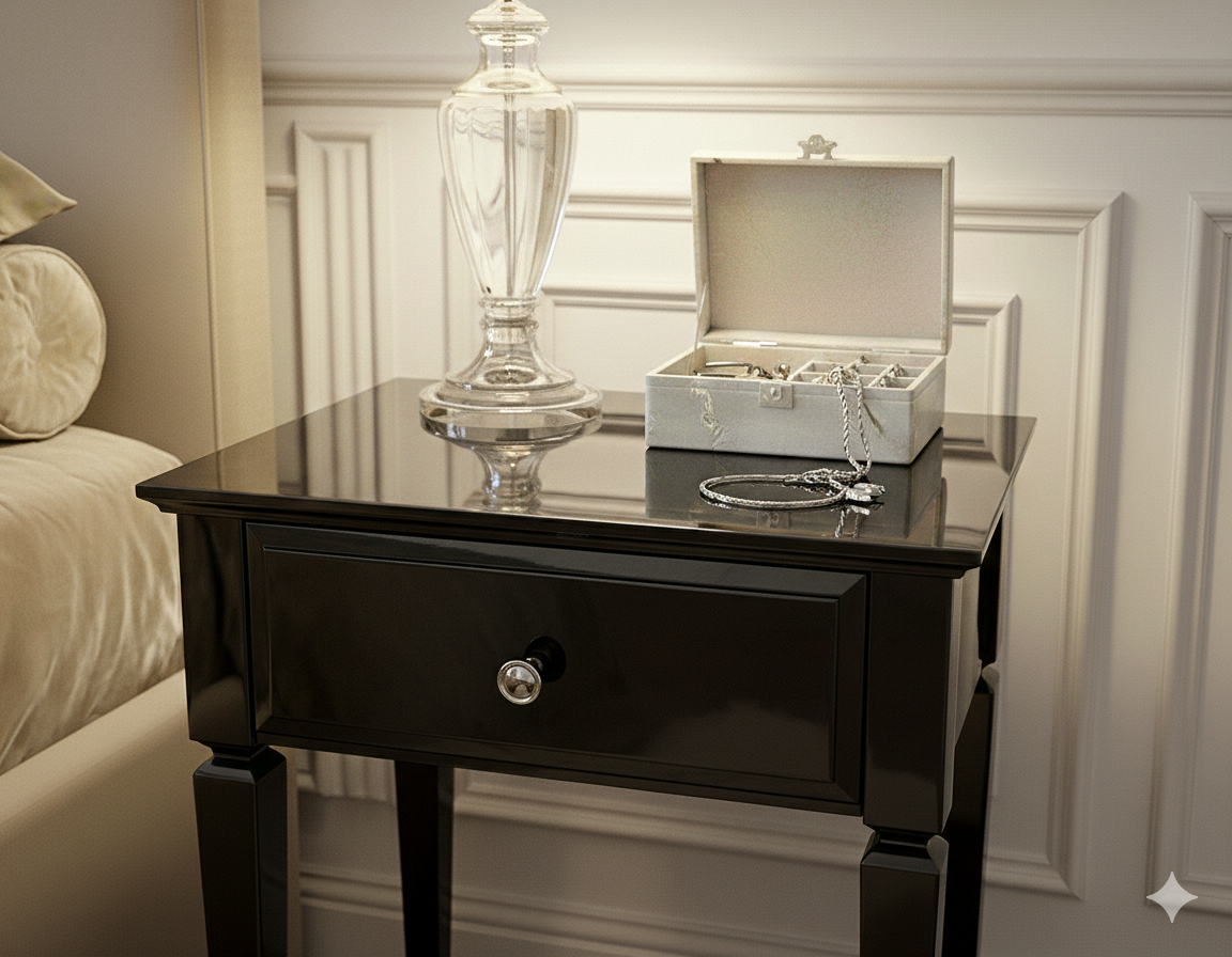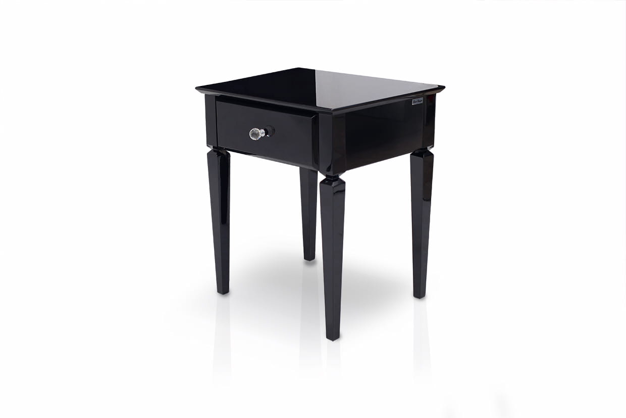 Czarny wysoki połysk nadaje meblowi głębi i luksusowego wykończenia, a kryształowe uchwyty wprowadzają subtelny blask i elegancję. Smukła forma sprawia, że stolik doskonale odnajduje się zarówno w przestronnych, jak i bardziej kameralnych aranżacjach.