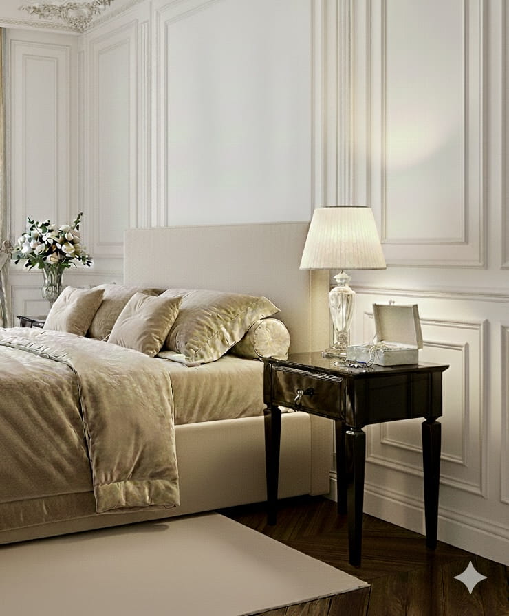 Stolik nocny glamour ASTURIA to eleganckie połączenie klasyki i nowoczesności inspirowane stylem art déco. Zaprojektowany z myślą o wyjątkowych wnętrzach, stanowi zarówno funkcjonalny element sypialni, jak i wyrafinowaną dekorację, która podkreśla charakter przestrzeni.